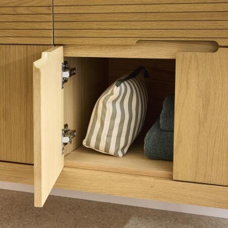 Le meuble sous vasque ALASKA 120 cm est une pièce maîtresse qui allie esthétisme et praticité. Fabriqué en MDF plaqué chêne naturel avec un cadre en chêne massif, il offre un look intemporel et chaleureux. Son plan en bois naturel accueille deux vasques à poser, créant un espace de toilette fluide et harmonieux. Grâce à ses deux tiroirs à coulisses et ses quatre portes à fermeture progressive, vous bénéficiez d’un rangement généreux et d’un accès facile à tous vos produits du quotidien.