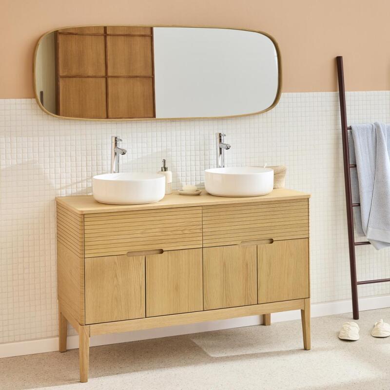 Le meuble sous vasque ALASKA 120 cm est conçu pour sublimer votre salle de bain tout en offrant un rangement optimisé. Fabriqué en chêne massif et MDF plaqué chêne naturel, il garantit une solidité et une élégance intemporelle. Ses deux tiroirs à coulisses et ses quatre portes à fermeture progressive permettent un accès fluide et silencieux à vos produits du quotidien. Son plan en chêne massif apporte une touche chaleureuse et raffinée, tandis que ses bords arrondis et ses lignes sculptées lui confèrent une élégance subtile et naturelle.
