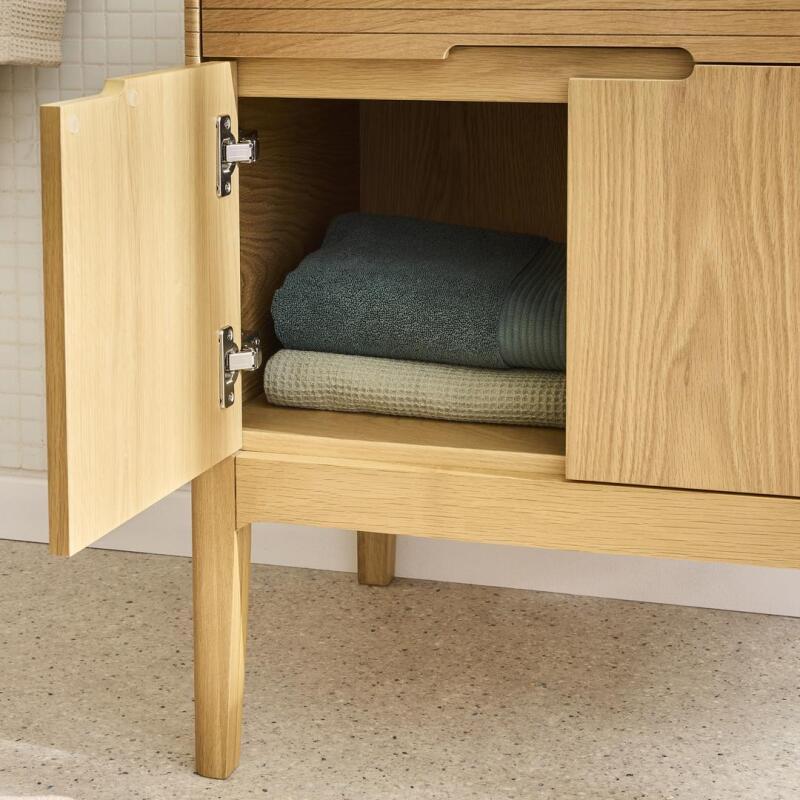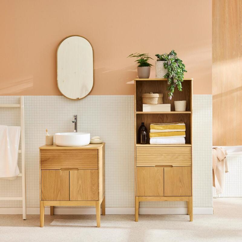 Le meuble sous vasque ALASKA 60 cm est la solution parfaite pour allier style et fonctionnalité dans une salle de bain compacte. Conçu en chêne massif et MDF plaqué chêne naturel, il séduit par son design épuré et son plan en bois authentique. Avec son tiroir à coulisses et ses deux portes à fermeture progressive, ce meuble offre un espace de rangement optimisé tout en assurant une utilisation silencieuse et fluide. Ses bords arrondis et ses lignes sculptées confèrent une touche raffinée et moderne à votre salle d’eau.