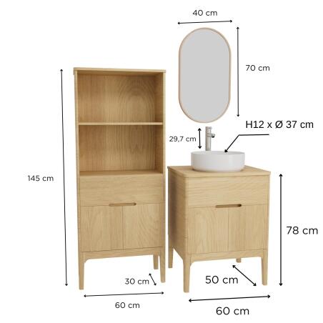 L’ensemble meuble double vasque 60 cm ALASKA + vasque DIEGO + robinet TAP + miroir PEPPER + colonne ALASKA est la combinaison parfaite pour une salle de bain élégante et optimisée. Avec son design en chêne naturel, ses rangements pratiques et ses finitions haut de gamme, cet ensemble transforme votre pièce en un espace chic et fonctionnel, même dans les petites surfaces.