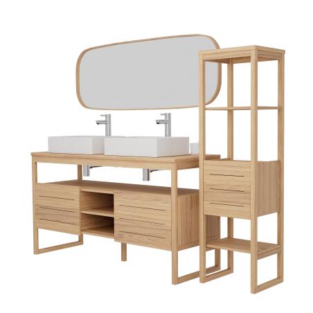 La colonne de salle de bain ATOLL offre un gain de place grâce à ses quatre niveaux de rangement, combinant niches ouvertes et fermées par une porte battante à fermeture progressive. Fabriquée en MDF avec un placage en chêne naturel et un piétement en acacia massif certifié FSC, cette colonne complète idéalement le meuble double vasque pour une salle de bain organisée et stylée.