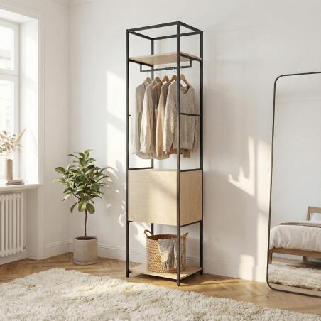 Le portant dressing JUNE allie élégance et praticité pour optimiser le rangement de votre entrée, dressing ou chambre. Cette penderie accueille avec soin vos vêtements, chaussures et accessoires, tout en offrant un design moderne qui s’intègre facilement à tout type d’intérieur. Ce modèle comprend 2 étagères ouvertes, un caisson fermé avec porte "push système" en panneaux de particules mélaminés (PPM), ainsi qu’une barre de penderie en acier époxy pour suspendre vos vêtements. Grâce à ses 6 combinaisons possibles, vous personnalisez l’aménagement selon vos besoins quotidiens. Conçu pour supporter une charge maximale de 45 kg, le portant JUNE combine des matériaux durables et une structure stable, assurant un intérieur organisé et stylé au fil du temps. Associez-le aux autres éléments modulables de la collection JUNE pour composer un dressing sur mesure.