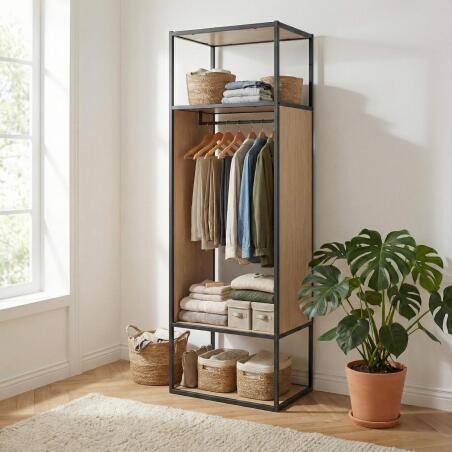 Le portant OSLO 60 cm se distingue par sa barre de penderie et ses deux espaces dédiés aux paniers de rangement, parfaits pour optimiser un petit espace. Idéal dans une entrée, un dressing ou une chambre, il permet d’organiser facilement vêtements, chaussures et accessoires tout en apportant une touche contemporaine.