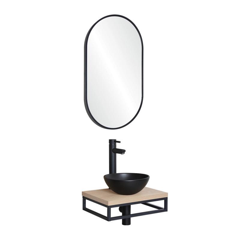 Cet ensemble comporte un meuble lave-main décor chêne avec une structure métallique noire mat, une vasque ronde noire mat, un robinet, ainsi qu'un miroir.