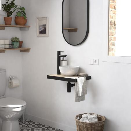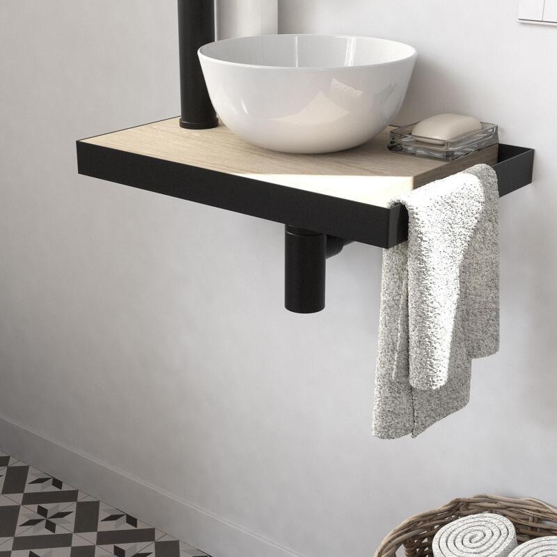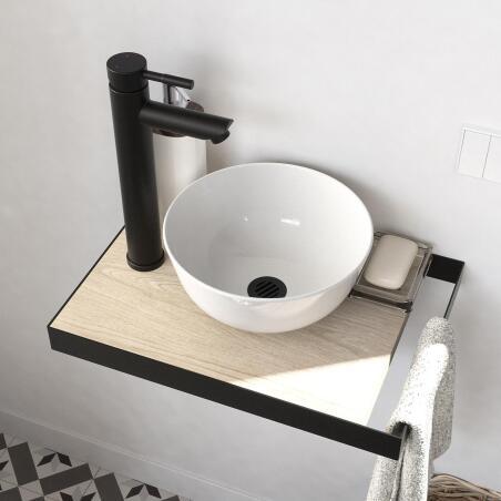 Le meuble lave-main SOHO de 45 cm en décor chêne avec son plan fin associé à sa structure métallique noire est la réponse à votre manque de place ! Sa pose suspendue, ainsi que son porte-serviettes côté allègent votre salle d’eau et son un gain de place appréciable. Le design moderne de ce meuble est rehaussé par sa finition décor chêne qui lui donne un effet naturel et qui offre une ambiance chaleureuse à votre espace. Sa fabrication en PPM (Panneaux de Particules Mélaminé) de haute qualité lui assure une véritable résistance à l’usure, vous n’aurez donc pas à vous inquiéter pour sa longévité ! Ce lave-main est également composé d’une vasque à poser blanche qui ajoute un contraste frappant à l’ensemble. Cette vasque de 26 cm de diamètre fabriquée en céramique est simple d’entretien, ce qui facilite son utilisation au quotidien. Sobre et épurée, elle complète parfaitement ce pack tout en optimisant l’espace pour garder à porter de mains vos accessoires de toilette.