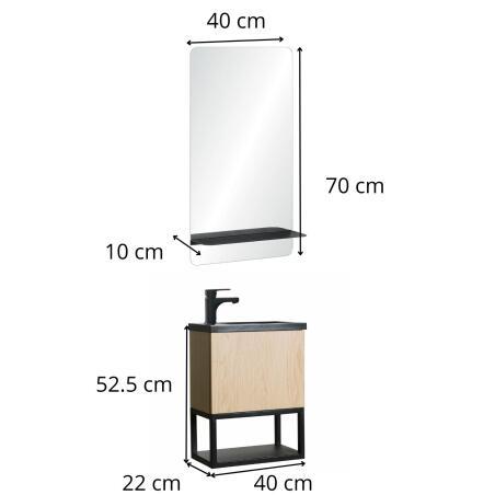 Ensemble lave-mains métal et bois avec robinet noir et miroir tablette