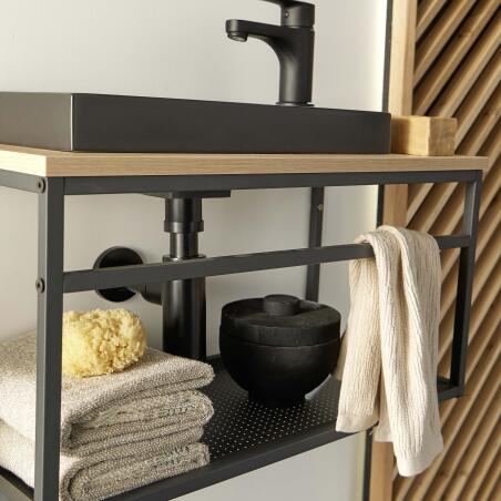 Le meuble lave-mains WILO apporte une touche moderne et tendance à votre petite pièce d’eau. Ce meuble compact de salle de bain se compose d’une structure en métal noir mat, d’une étagère en métal perforé, d’un plan en panneaux de particules mélaminés (PPM) et d’une vasque réversible en résine de synthèse, disponible en blanc ou noir pour s’adapter à vos contraintes d’installation. Ce pack complet comprend également un robinet (flexibles 3/8", aérateur/brise-jet en ABS, cartouche céramique) doté d’une poignée confortable, ainsi qu’un miroir avec tablette métallique, parfait pour optimiser l’espace tout en apportant un style épuré et pratique. Sa tablette pourra aisément accueillir vos petits produits du quotidien, avec sa charge maximale de 3Kg.