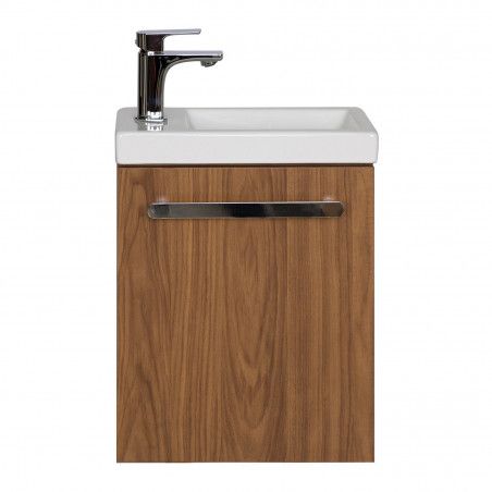 • Les variantes décor chêne avec vasque blanche, décor noyer et noir satiné sont quant à elles équipées d’une vasque en céramique blanche, pour une finition lumineuse et intemporelle.