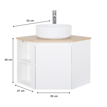 Transformez votre salle de bain avec le meuble sous vasque d’angle Sorrento, spécialement conçu pour optimiser les petits espaces. Grâce à son design ingénieux, il s’adapte parfaitement aux coins de votre pièce, libérant de l’espace au sol tout en offrant un rangement fonctionnel. Ses niches ouvertes et son étagère intégrée permettent de garder vos produits de toilette à portée de main, sans sacrifier l’élégance. Avec ses lignes épurées, il apporte une touche moderne et sophistiquée à votre salle d’eau. Compatible avec une vasque ronde jusqu’à 37 cm, ce meuble est la solution parfaite pour combiner esthétique et praticité dans une salle de bain optimisée.