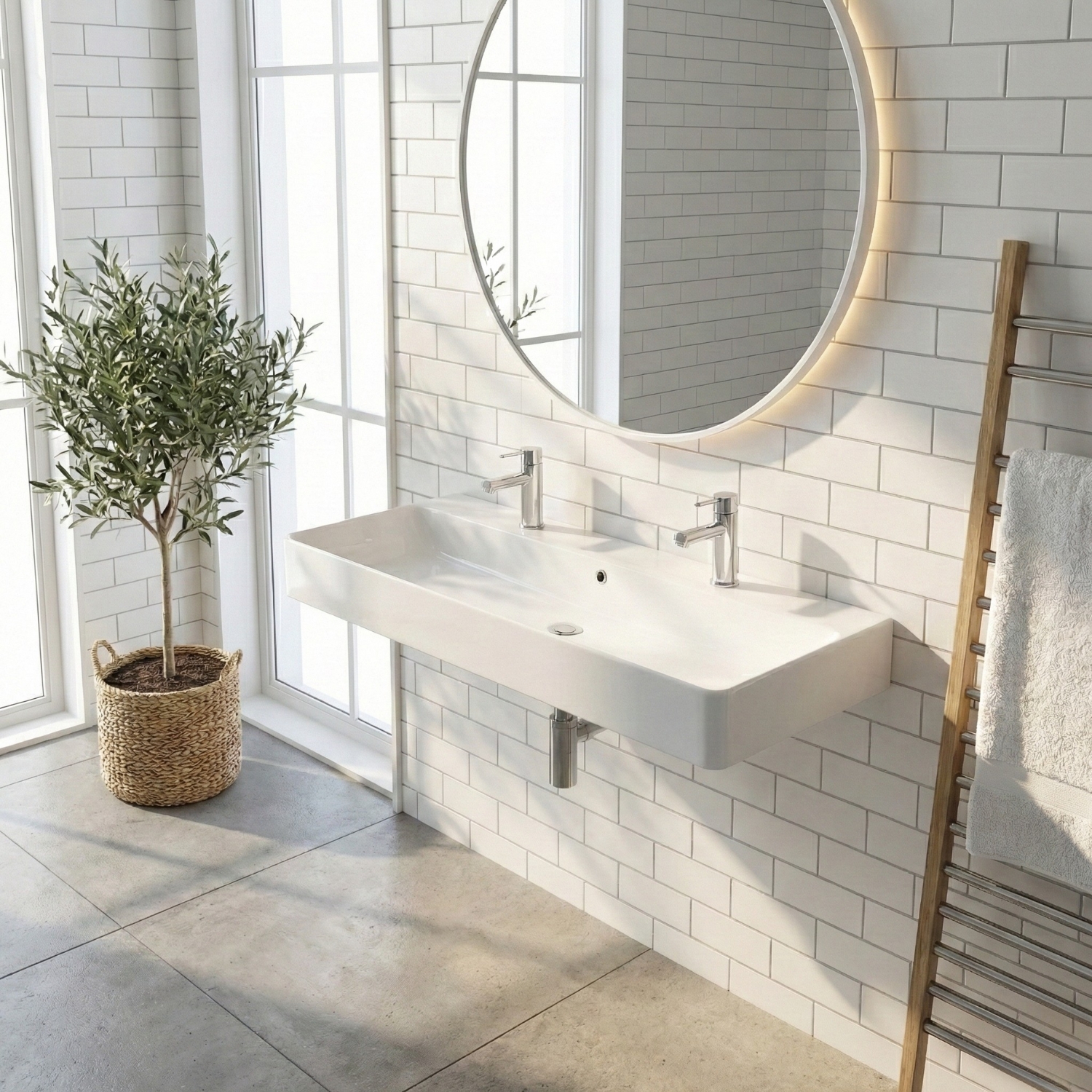 Esthétiquement, une vasque de 110 cm suspendue impose son style. Elle crée une ligne horizontale forte qui structure la salle de bain. Associée à un grand miroir LED, elle transforme une salle de bain banale en une suite parentale de standing.