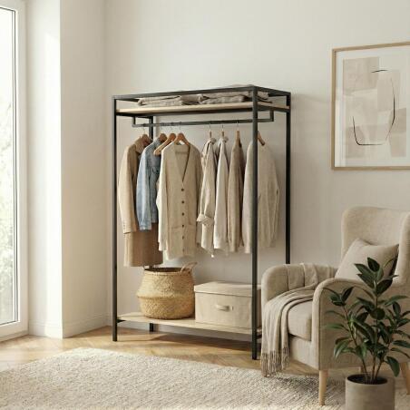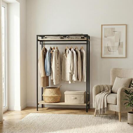 Le portant vêtements CINA est la solution idéale pour organiser votre chambre ou votre dressing avec style. Pensé pour offrir un maximum de rangement, il combine une barre de penderie pour suspendre vos vêtements et deux étagères pratiques pour vos habits pliés ou accessoires. Son design épuré s’intègre parfaitement à tous les intérieurs, apportant une touche contemporaine tout en revisitant la penderie classique. Fabriqué en acier époxy, ce portant sur pieds garantit une excellente robustesse et stabilité dans la durée. Il supporte une charge maximale de 20 kg pour répondre à vos besoins quotidiens.